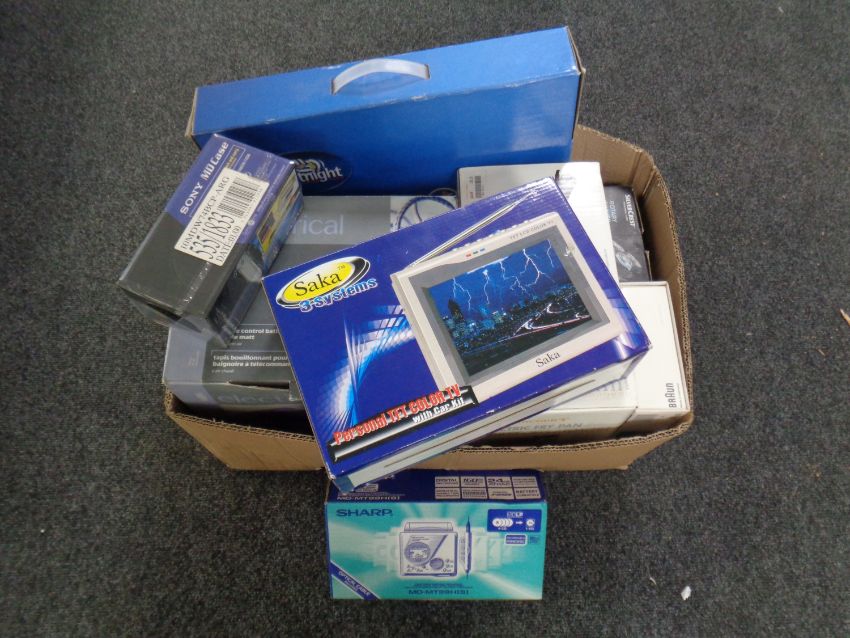 A box containing a quantity of boxed electricals including mini cooker, mini colour TV, Rotary shavers, portable mini disc recorder etc