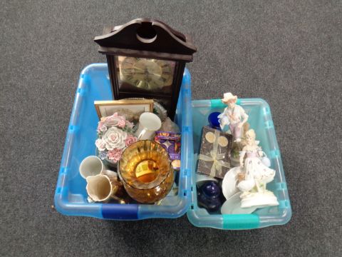 Two boxes containing 20th century porcelain figures, amber glass vase, contemporary carpenter's wall clock etc