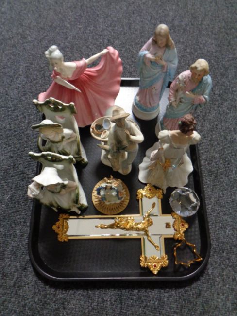 A tray of gilt crucifix religious figure, continental figures, Royal Doulton figure of Elaine