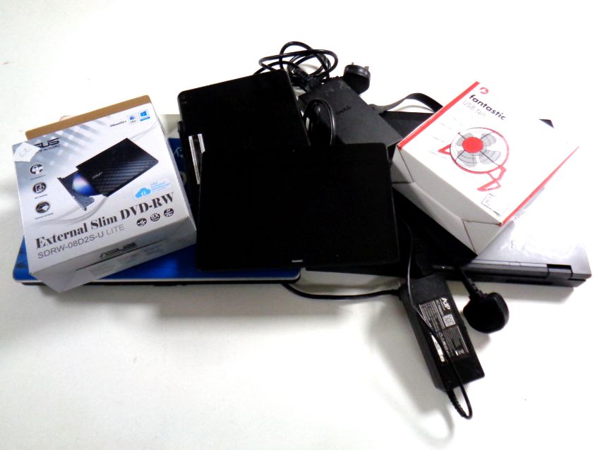 A Brother printer together with USB fan, slim DVD rewrite, further electricals, laptop etc