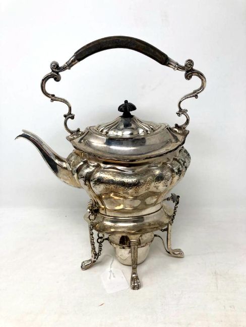 A silver plated spirit kettle on stand with burner