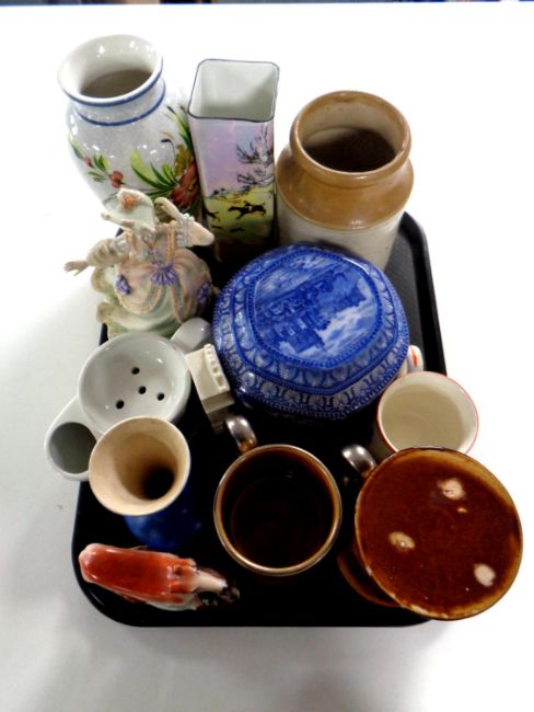 A tray containing miscellaneous china to include Staffordshire greyhound, Ringtons Maling caddy, Burleigh ware lustre vase depicting a hunting scene, figure of a lady etc