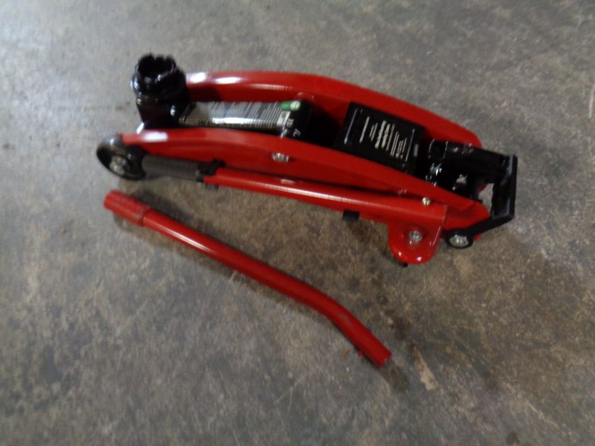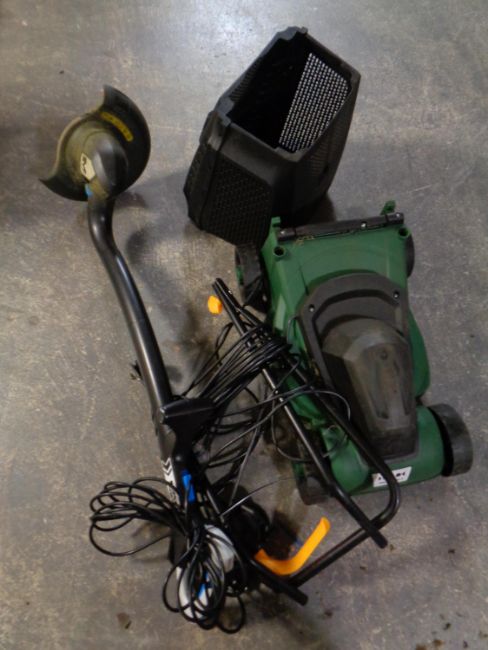 A car jack (appears new) together with an electric lawn mower and a strimmer