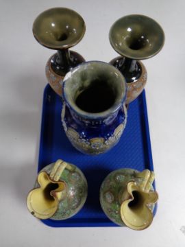 A tray containing a pair of Royal Doulton Lambeth vases (as found) together with a further Royal Doulton vase and pair of jugs (as found)