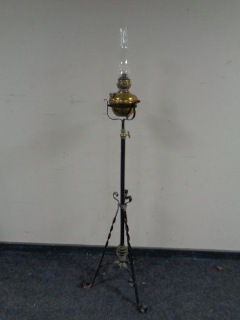 A wrought iron and brass standard oil lamp