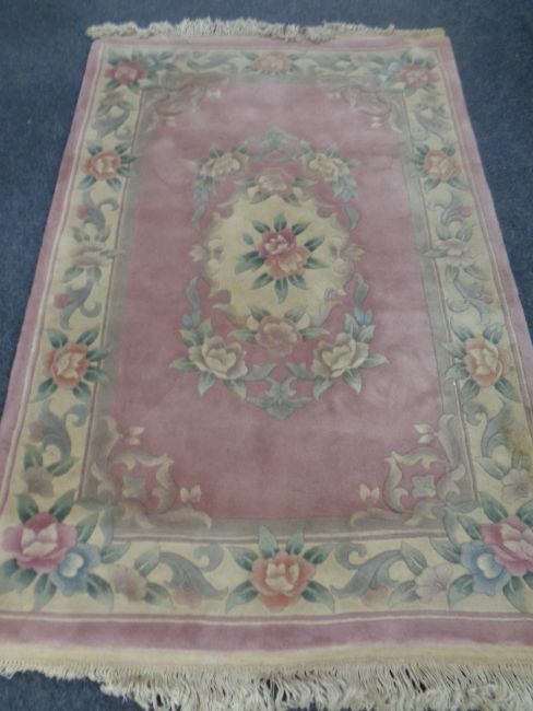 A fringed Chinese carpet on pink ground, 201 x 121 cm
