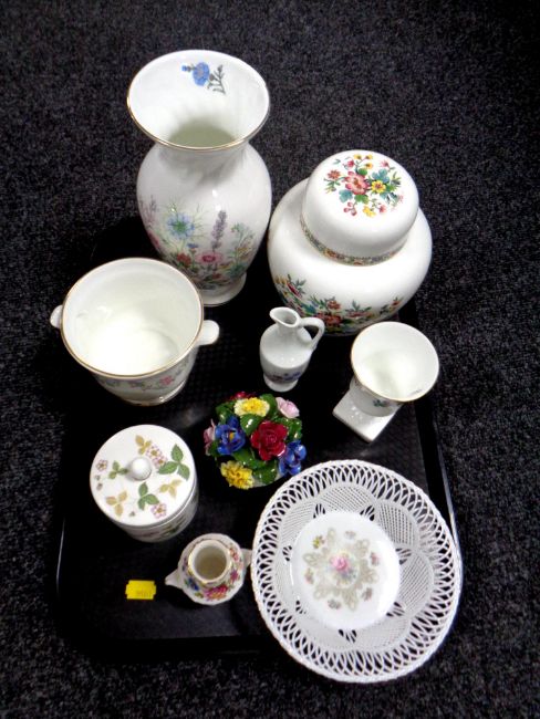 A tray containing a quantity of Aynsley china including Wild Tudor vase, Coalport Ming Rose lidded ginger jar, further china including Wedgwood, Royal Grafton etc