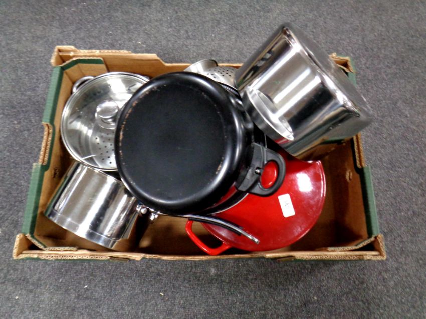 A box of cast cooking pot, stainless pans etc