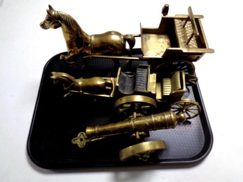 A tray containing two brass horse and cart figures together with a brass model of a cannon