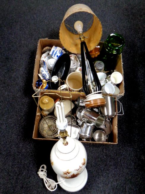 Two boxes containing 20th century stainless steel and plated wares including tankards, rose bowl, together with two stoneware bottles, pottery stein, commemorative china, two table lamps etc