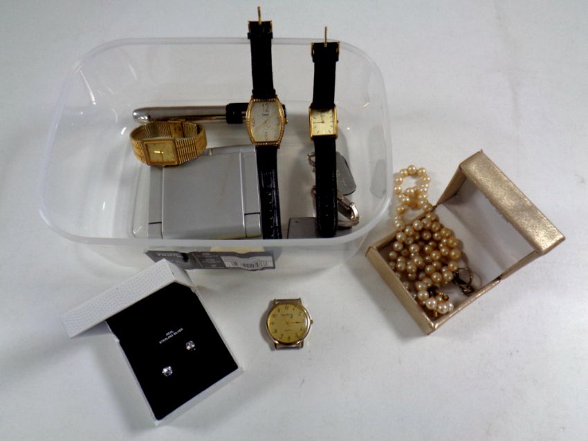 A box containing wristwatches including Citizen, pair of Warren James sterling silver earrings, costume pearls, pocket knives, pocket calculator etc