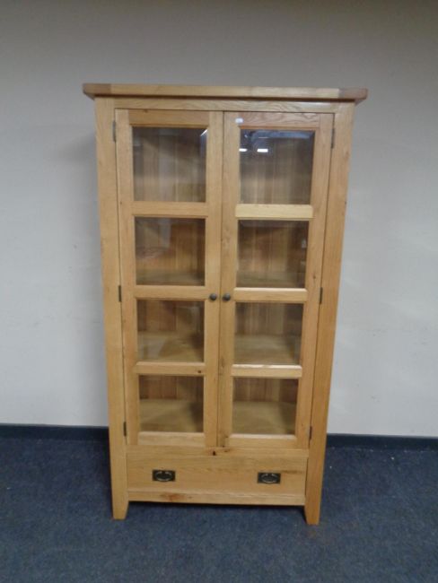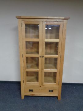 A contemporary glazed oak bookcase fitted a drawer beneath