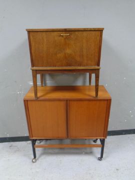 A 20th century teak shutter door low cabinet together with a teak fall front cabinet