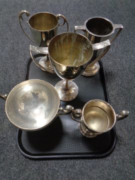 A tray containing five silver plated presentation trophies