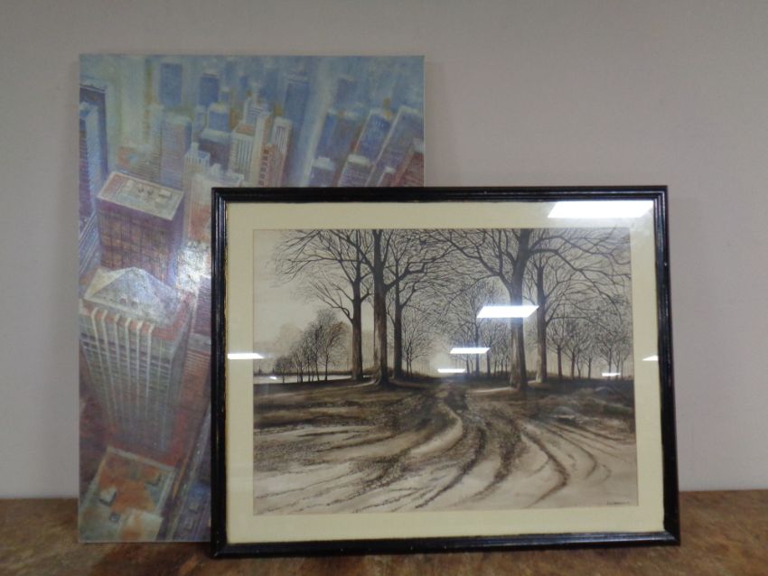 A box containing duvet sets and pillow cases, three pairs of curtains, table cloth, napkins, table runner etc, together with two prints