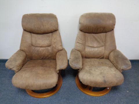 A pair of contemporary relaxer armchairs in brown suede upholstery