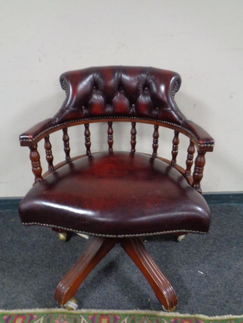 A Chesterfield style swivel desk chair in burgundy leather upholstery