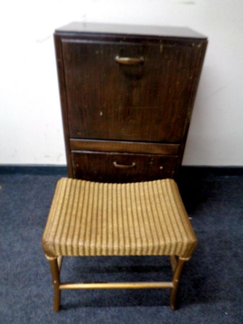 A 20th century John Carter double door record cabinet together with a gold Lloyd Loom dressing table stool