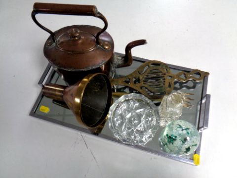 A chrome framed mirrored serving tray together with assorted metal wares and glass ware to include copper kettle, trivet, paperweight etc