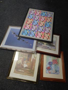 A multi-collage print depicting Marilyn Monroe, together with five further prints.