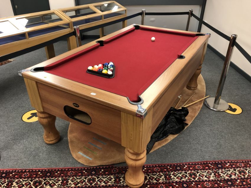 A 'Geordie' branded pool table, set of balls, triangle, four cues and extension.