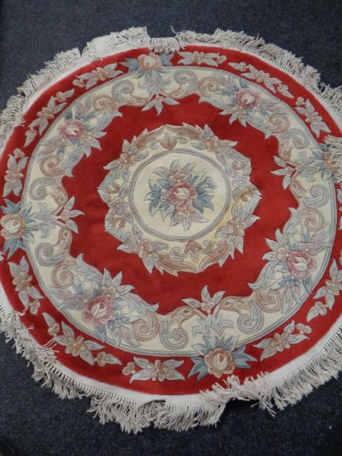 A circular fringed Chinese rug on red ground.