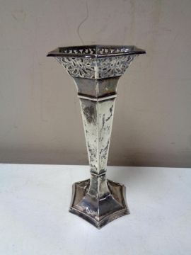 A loaded silver hexagonal pierced rimmed vase, height 15cm