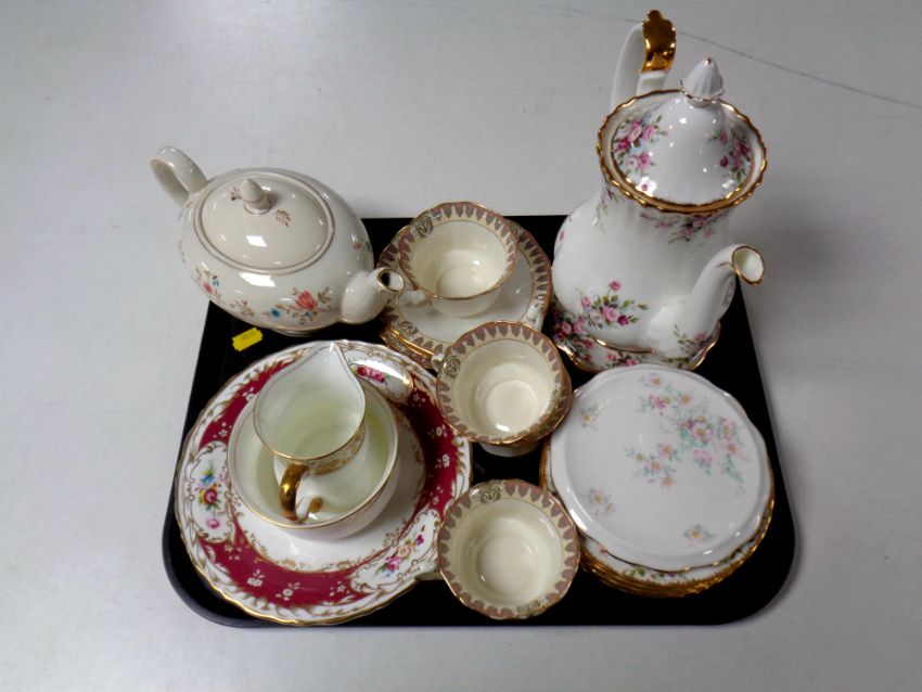 A tray containing assorted ceramics to include Royal Albert Cottage Garden teapot on stand, tea plates, part chain tea service, Saddler Mayfair teapot, Grafton china, milk jug and sugar basin.
