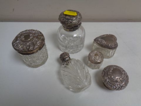 Five cut glass silver topped dressing table jars and scent bottles, together with a further silver scent bottle lid.