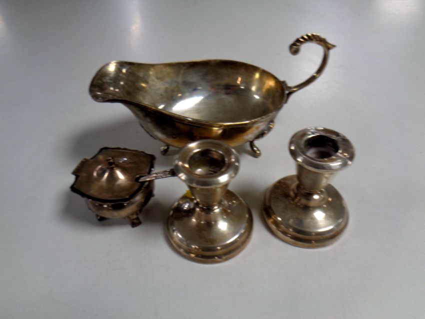 A pair of squat silver candlesticks, Birmingham marks, together with a plated gravy boat and mustard pot with spoon.