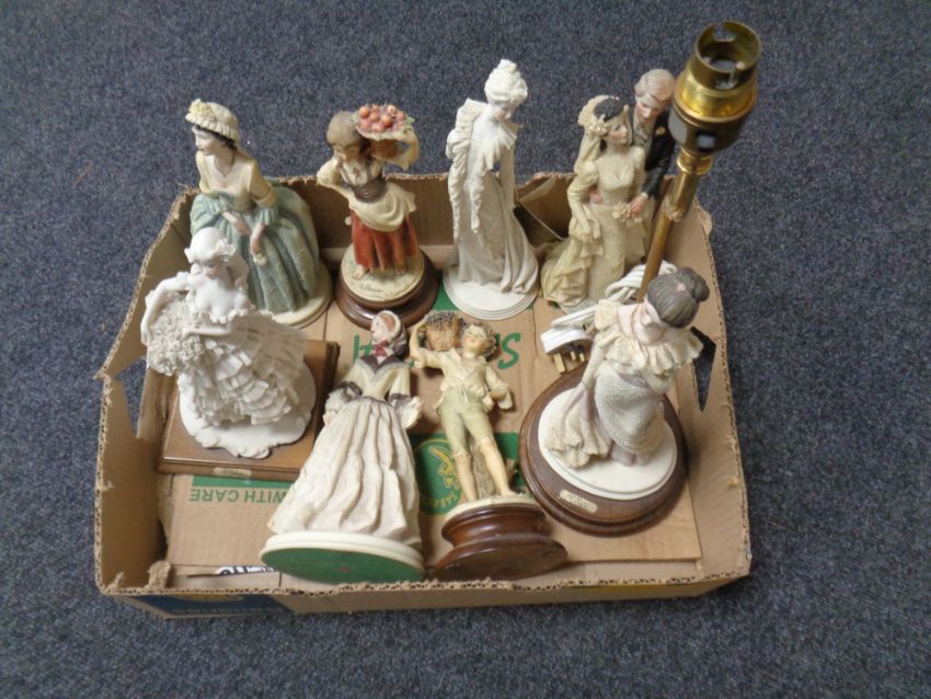 A box of assorted contemporary figurines, together with a figural table lamp.