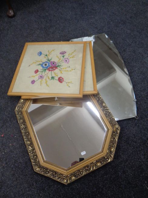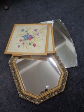 Two framed needlework panels together with a gilt framed octagonal mirror and a frameless bevelled mirror.