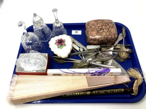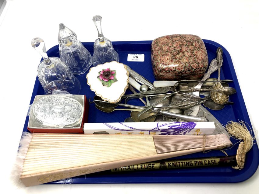 A tray containing hand fans, plated cutlery, glass bells, trinket box etc.