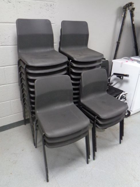 A set of twenty six black plastic stacking chairs