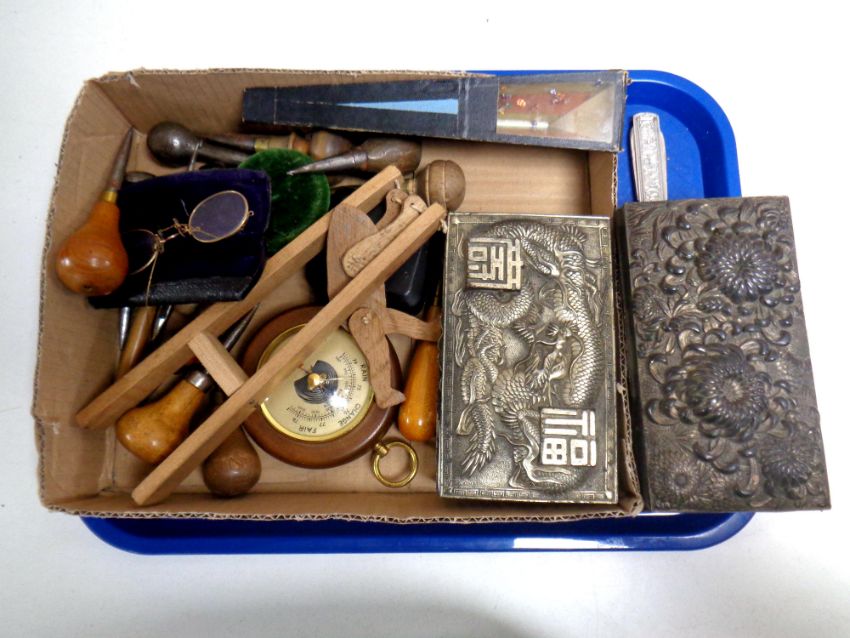 A tray of miscellany to include hand tools, wooden monkey toy, pair of yellow metal rimmed glasses, two oriental style embossed trinket boxes etc.