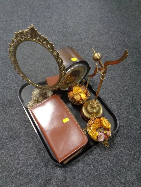 A tray of oak cased Art Deco mantel clock, brass framed dressing table mirror, brass pan scales, together with a leather cased gent's travel set.