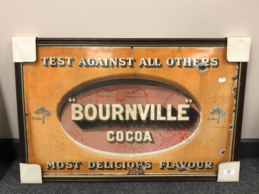 A 20th century enamelled advertising sign 'Bournville Cocoa - Test Against All Others - Most Delicious Flavour', 75cm by 47cm. framed.