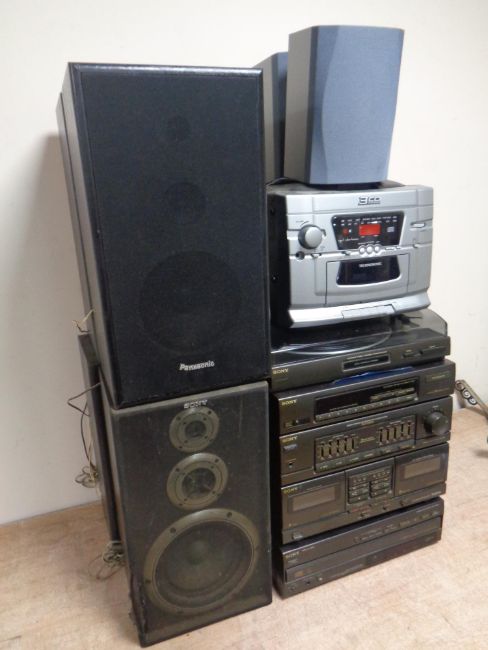 A Sony hifi system with speakers, together with a Technosonic hifi and speakers and a further pair of Panasonic speakers.