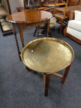 An Edwardian oak occasional table and folding Eastern brass topped table