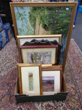 A J Walton oil on board, bridge over a river, in gilt frame. Together with a box containing a large quantity of assorted framed pictures and prints to include a Keith Proctor signed print.