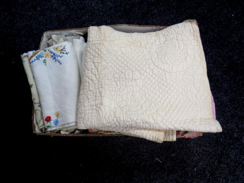 A box of table linens, Paisley throw, bed cover etc