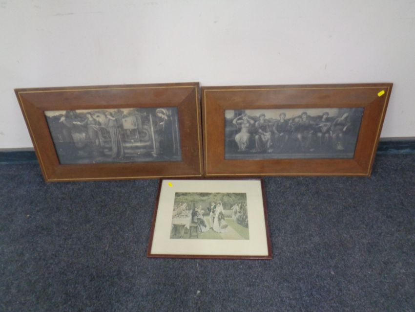 Two late 19th century monochrome prints depicting female figures, together with a further print depicting Victorians in a garden.