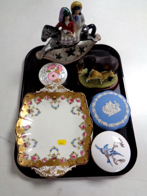 A tray of assorted ceramics to include Wedgwood and Royal Doulton trinket dishes, Staffordshire crackle glaze rocking horse, Border Fine arts figure of a horse with foal, Royal Cauldon and Aynsley sandwich plates.