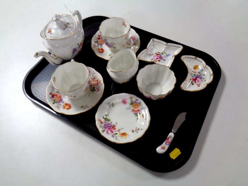 A tray containing eleven pieces of Royal Crown Derby 'Derby Roses' bone china to include a seven piece tea for two.
