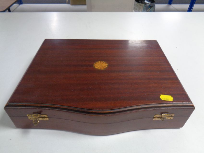 An Edwardian inlaid mahogany canteen containing stainless steel cutlery.