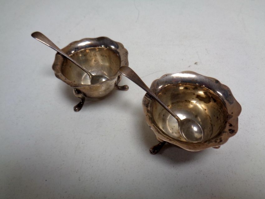 A pair of silver salts with spoons