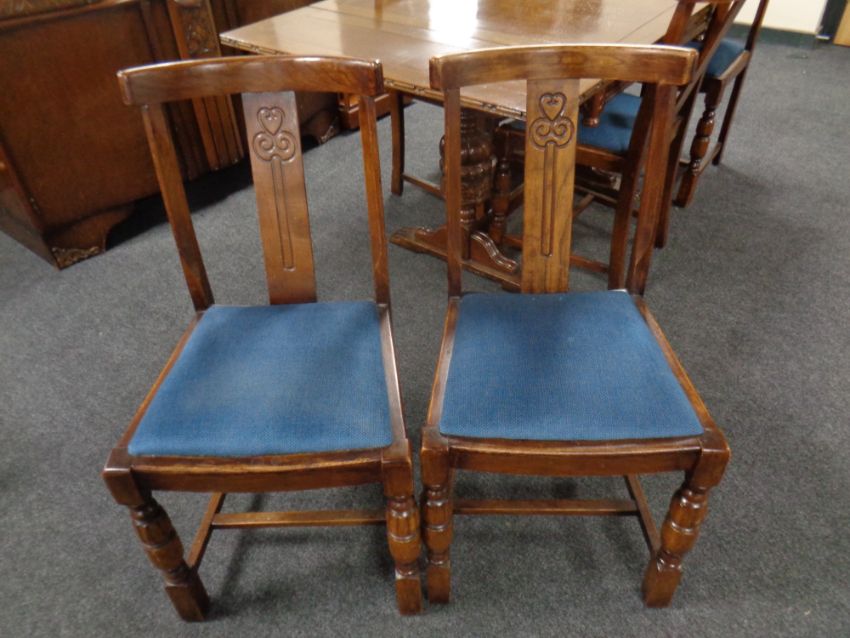 An eight piece 20th century carved oak dining room suite comprising of shaped front sideboard, extending table and six chairs.