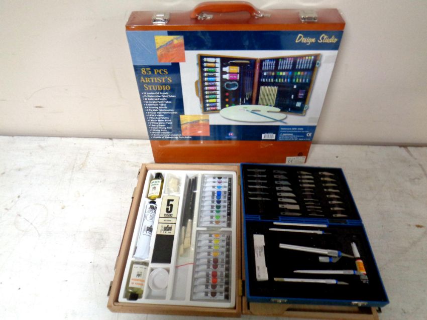 Two boxes of art supplies together with a further box containing scalpels with blades.