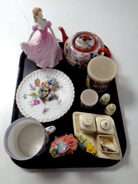 A tray of assorted ceramics to include Wade whimsies, 20th century Japanese teapot, Royal Doulton Classic figure 'Sweetheart', together with a further Royal Doulton figure 'Cissie' (a/f) etc.