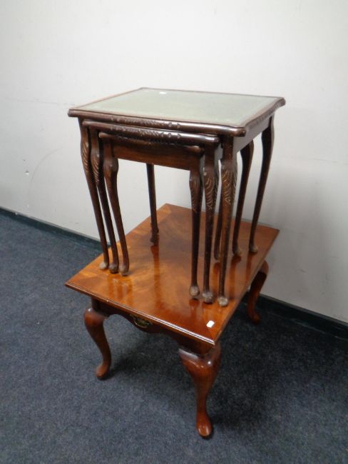 A nest of three tables with tooled leather inset panels together with a further contemporary lamp table